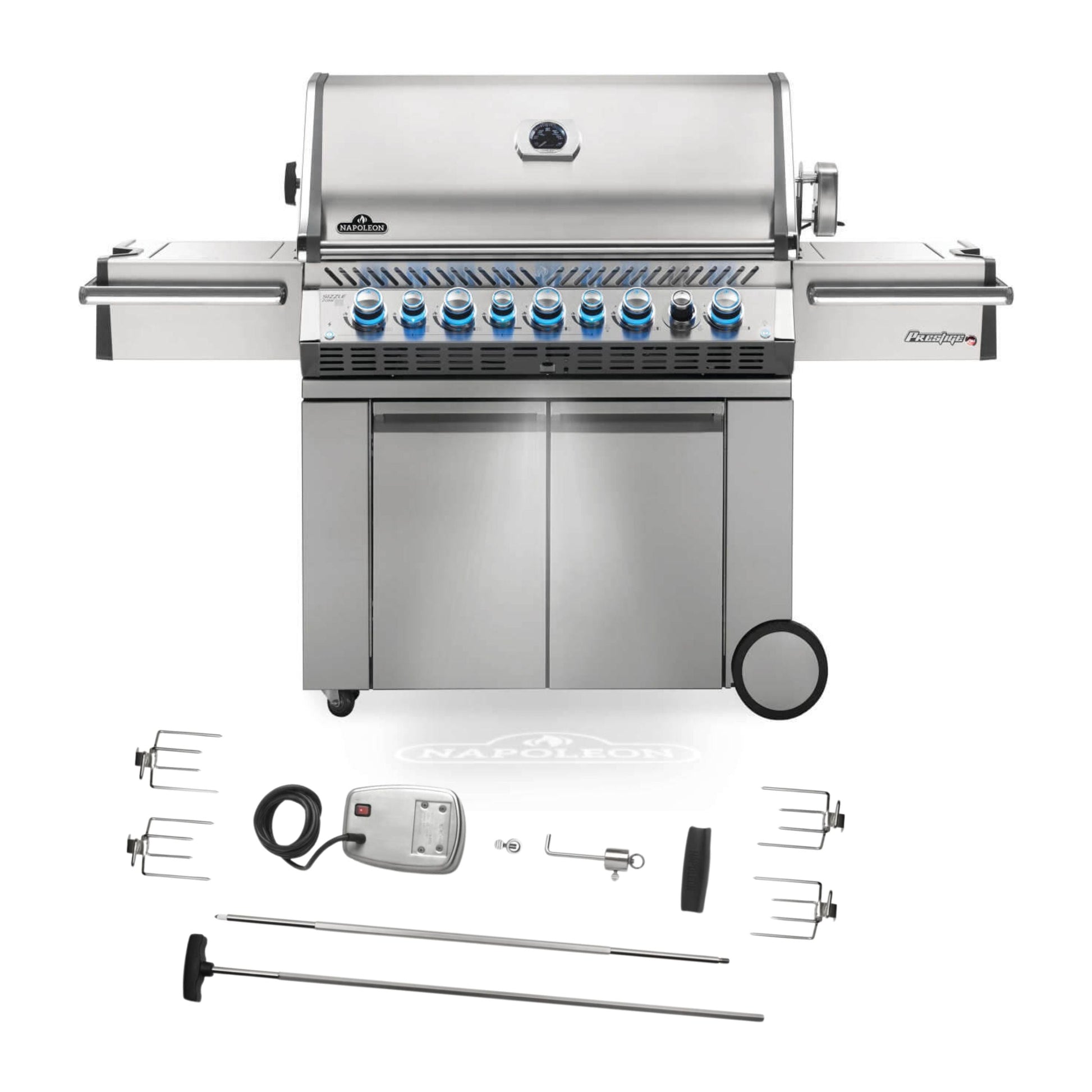 With features you don't see on most grills, the Napoleon Prestige PRO™ 665 Propane Gas Grill with Infrared Rear and Side Burners has everything needed for professional-grade backyard grilling. Superior heat retention provides oven-like performance and first-rate searing; you'll know it's a Napoleon with those iconic WAVE™ cooking grids for those distinctive sear marks and proximity lighting. Use the integrated smoker tray and dedicated burner to add smoke to your favourite grilled dishes. On the outside, a shining stainless steel body provides durability against the elements, while chrome details add luxury. Not just durable on the outside; under the lid is the same quality stainless steel used for the cooking grids, tube burners and dual-level sear plates. The LED Spectrum NIGHT LIGHT™ Control Knobs have near limitless colour options making night-time entertaining a breeze, and they also glow red when the gas is left on as a safety feature. Enjoy evenly cooked restaurant-style meals with the rear infrared burner and rotisserie.